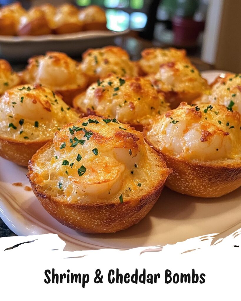 - Let cool slightly before serving. Enjoy your delightful shrimp and cheddar garlic bread bombs!